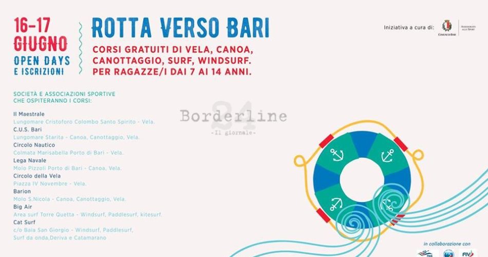 RottaVersoBari è un progetto dell’assessorato allo Sport del Comune di Bari per avvicinare gratuitamente ragazze/i baresi dai 7 ai 14 anni agli sport nautici. Grazie alla collaborazione con le federazioni sportive e tutti i circoli nautici e alle associazioni della città sarà possibile iscriversi ad un corso gratuito di circa 20 ore di Vela, Canoa, Canottaggio, Windsurf, Paddlesurf, Kitesurf, Surf da Onda, Deriva e Catamarano.