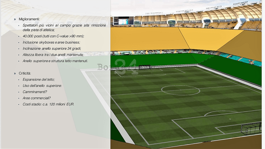 Lo studio di pre fattibilità proposto dalla Fc Bari 1908 per la ristrutturazione dello stadio San Nicola ha l’obiettivo di accorciare le distanze tra gli spettatori e il campo da gioco, rimuovere la pista di atletica inutilizzata e ridurre la capienza complessiva dell’impianto da 58 mila a 40 mila posti. Prevista anche la riduzione della pendenza dell’anello superiore e la creazione di skyboxes e aree business.