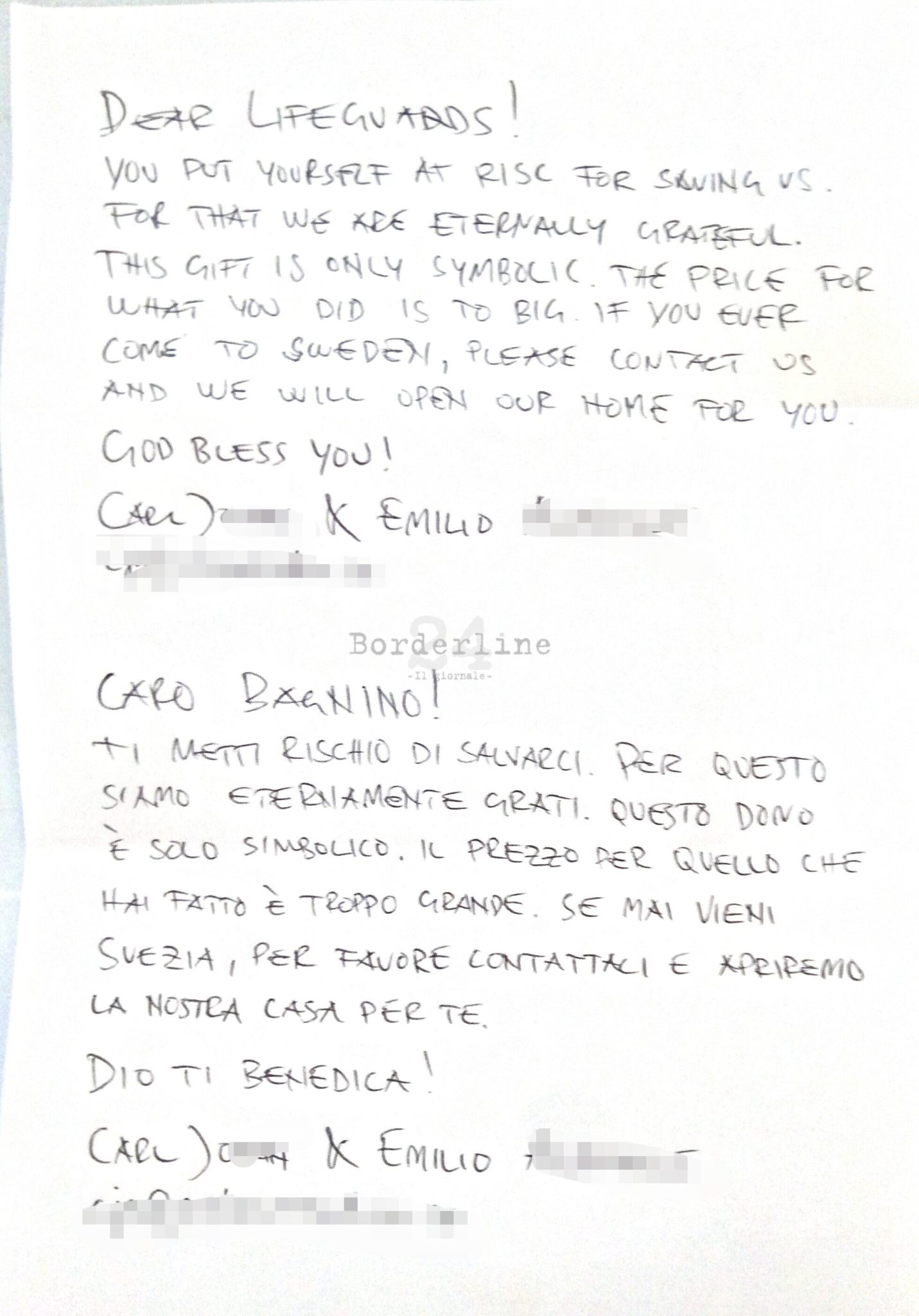 I due turisti svedesi hanno ringraziato Michele per averli salvati. Poche righe in italiano e inglese.