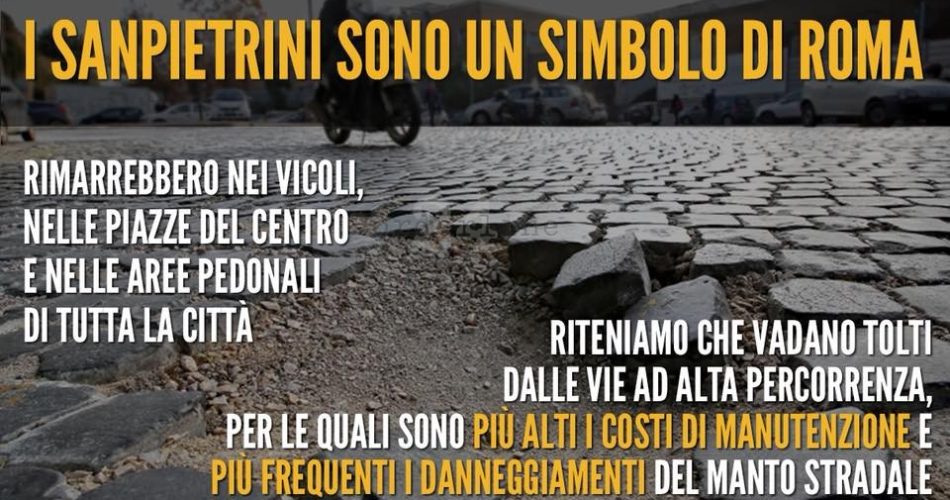 Via i sampietrini da alcune piazze e vie del centro ad alta percorrenza. La proposta del Campidoglio è stata lanciata oggi dal sindaco Virginia Raggi su Facebook. “I sampietrini sono un simbolo di Roma ma vogliamo valutare la possibilità di toglierli dalle vie ad alta percorrenza, per le quali i costi di manutenzione sono molto elevati e dove sono più frequenti i danneggiamenti del manto stradale – scrive Raggi – vogliamo aprire un grande dibattito pubblico: per questo motivo ho scritto una lettera alla Sovrintendenza ai Beni culturali del Campidoglio e alla Soprintendenza statale”. Secondo il Campidoglio le strade interessate alla rimozione potrebbero essere: piazza Venezia, via IV Novembre, via Nazionale, via di San Gregorio, via dei Cerchi, viale Aventino; ma anche ad altri punti che si trovano al di fuori del perimetro del centro storico, come Porta Maggiore, via Crescenzio e viale Somalia. Lo riporta l’Ansa.