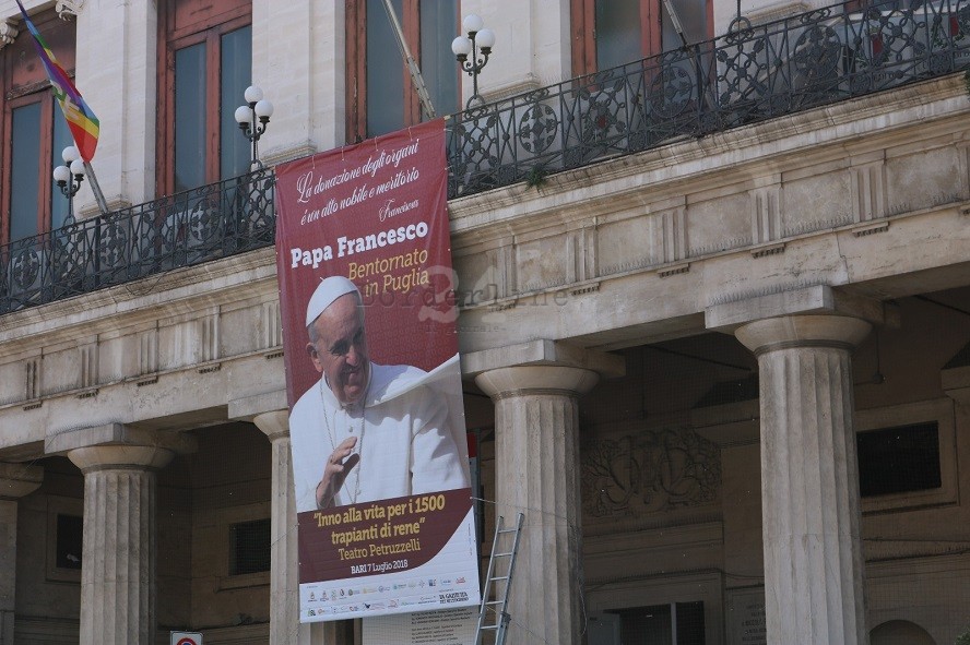 Drappi colorati sul lungomare, palco in allestimento a largo Giannella, gigantografia di benvenuto sulla facciata del Comune. A Bari proseguono i preparativi per la visita di papa Francesco che tra cinque giorni (7 luglio) incontrerà i capi delle Chiese cristiane del Medio Oriente. “Su di te sia pace!”, è il messaggio scritto sulle bandierine installate dagli operai questa mattina (foto in basso).