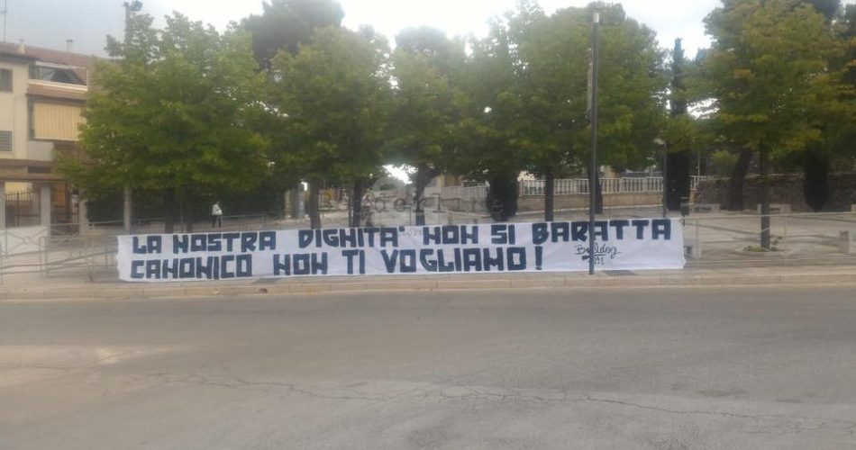 Uno striscione degli Ultras – Bulldog è stato sistemato sotto la residenza di Nicola Canonico, l’imprenditore che ieri aveva offerto la disponibilità di cedere il titolo del Bisceglie al Bari, accorpandoli e facendo ripartire la squadra dalla serie C.