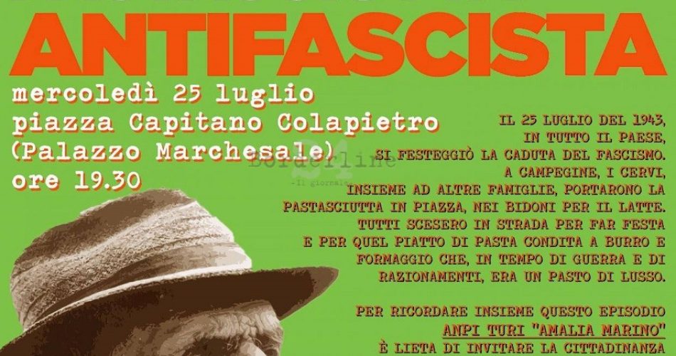 Mercoledì 25 luglio anche Turi, dalle 19.30, in piazza Colapietro, ospita un evento dedicato alla “Pastasciutta antifascista” organizzato dalla sezione locale dell’Associazione nazionale partigiani d’Italia “Amalia Marino”, e patrocinato, tra gli altri, da Aiab (Associazione italiana per l’agricoltura biologica) Puglia e Legacoop Puglia. Interverranno la partigiana e saggista Lidia Menapace, la presidente regionale di Aiab, Patrizia Masiello, e Ferdinando Pappalardo, coordinatore Anpi Puglia. Al termine del dibattito, in programma uno spettacolo musicale di Ivan Dell’Edera. Nel corso della serata degustazione gratuita con prodotti biologici offerti da Aiab Puglia, tra cui la pasta Oro del Parco di Santeramo in Colle.