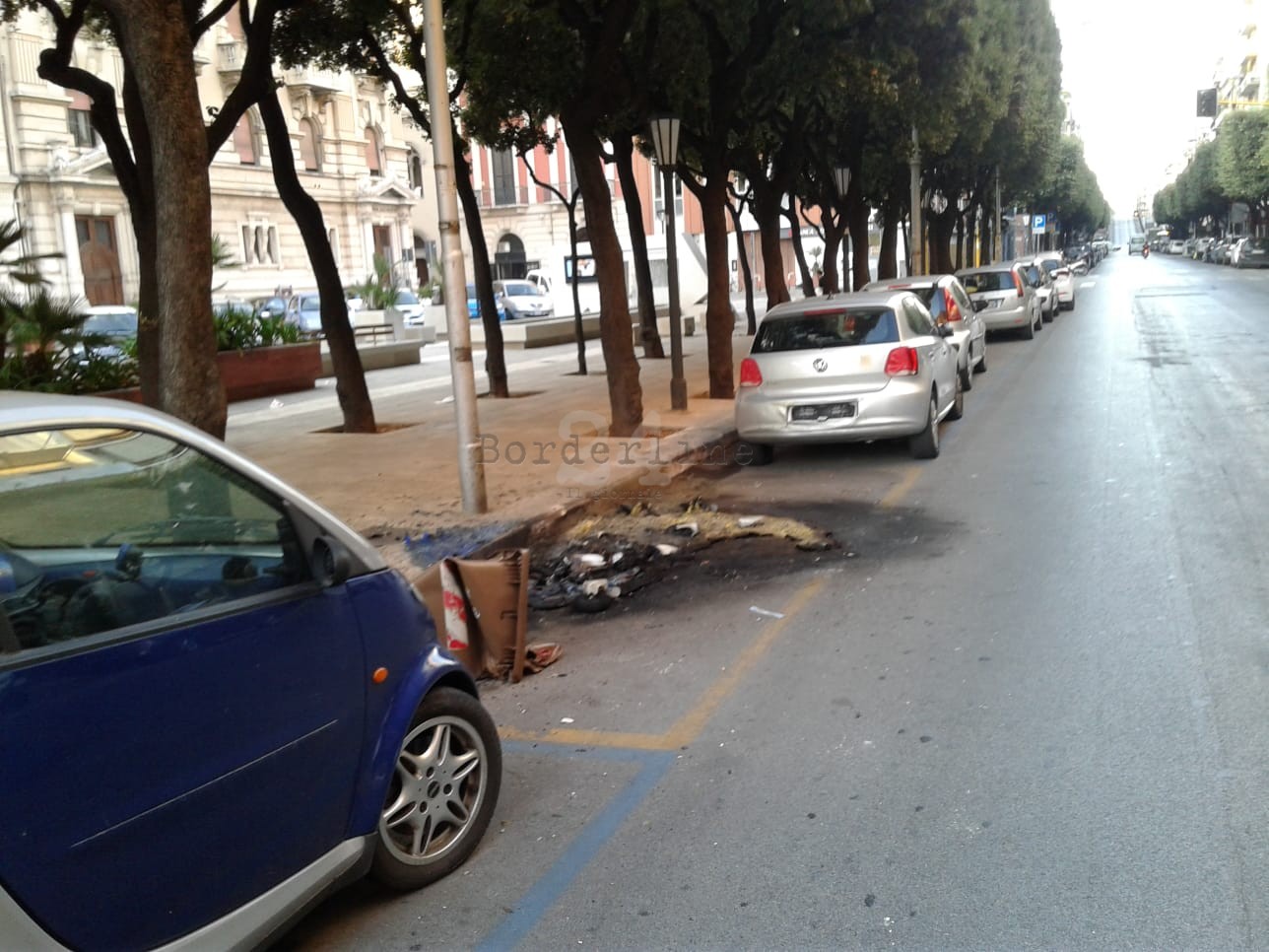 Bari, un’auto e nove cassonetti incendiati in corso Cavour. Persichella (Amiu): “Siamo ormai un servizio di protezione civile”