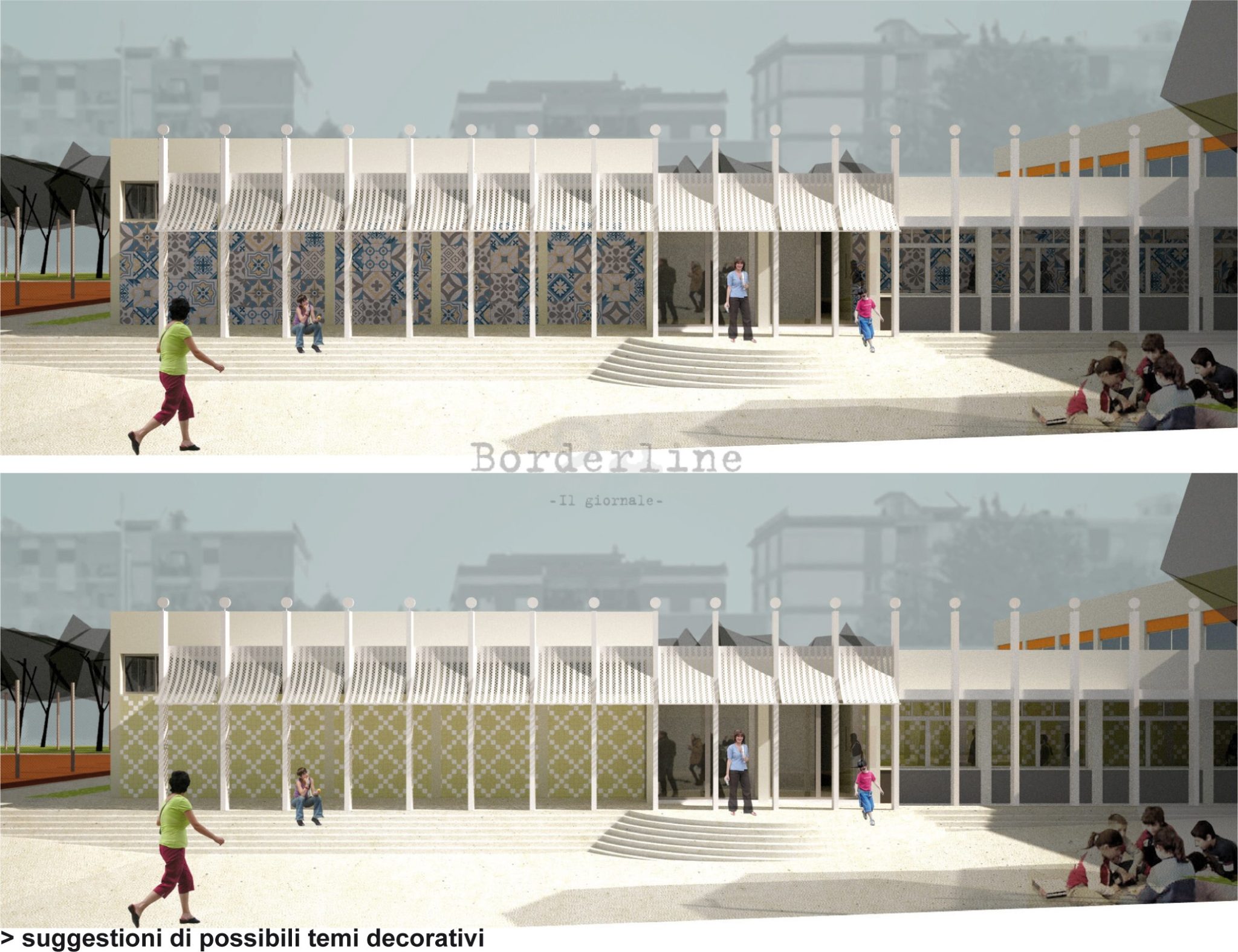 Preliminarmente alla progettazione definitiva, attraverso un concorso in cui verranno coinvolti gli studenti, verranno scelte le migliori proposte per realizzare il nuovo rivestimento esterno della palestra, utilizzando le nuove piastrelle come tessere di un grande mosaico su temi da concordare con la dirigenza scolastica ed il corpo docente
