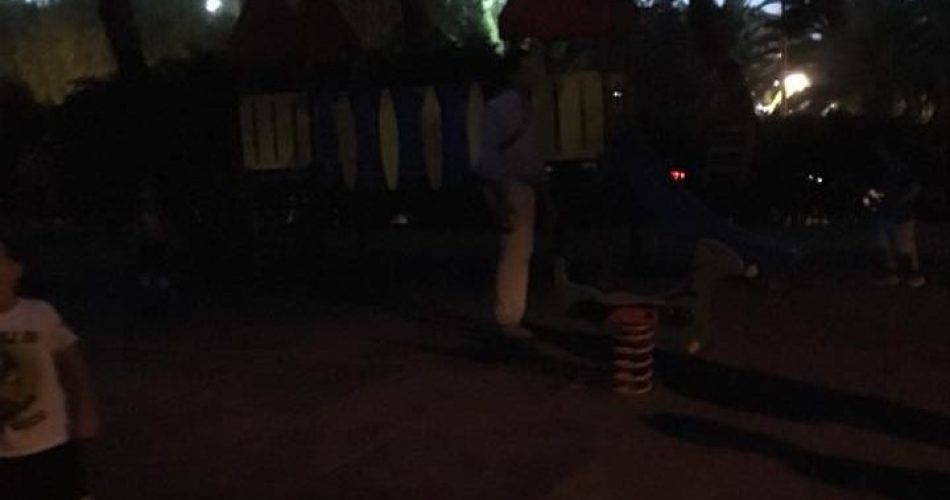 Come si nota dalla foto, ci sono decine di bambini che salgono su scivoli e sulle casette in legno completamente al buio. Con notevoli pericoli per la loro sicurezza. Le famiglie chiedono un intervento da parte del Comune.