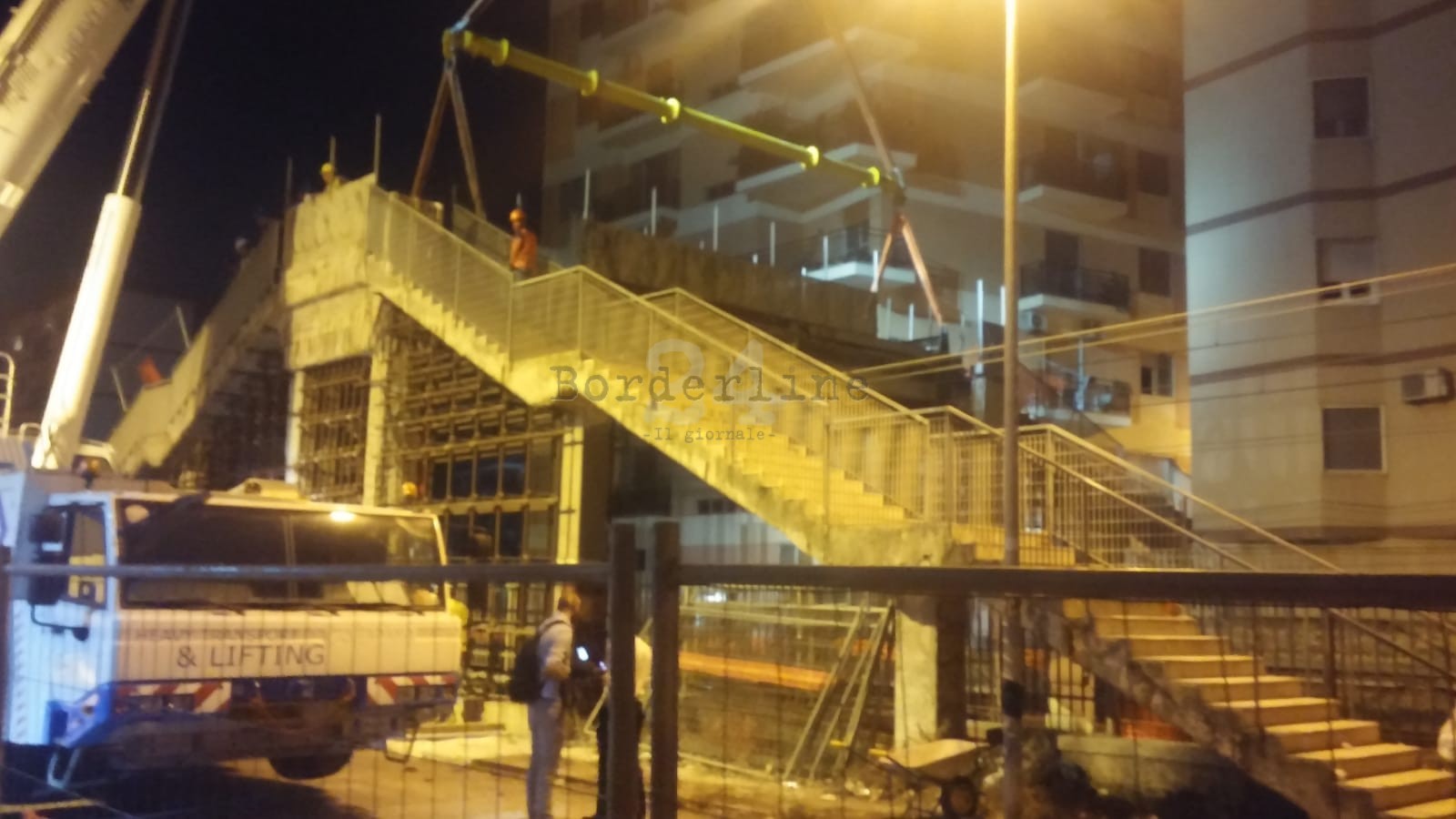 I lavori di demolizione della passerella pedonale di via Imperatore Traiano procedono come da cronoprogramma: e questa notte a partire dalle ore 23.30 si sta provedento con lo smontaggio delle travi che costituiscono la struttura del ponte pedonale. Già dalla scorsa notte sono stati avviati i lavori per preparare l’operazione con il montaggio delle cosiddette “selle” che permetteranno di sollevare e spostare le travi in cemento armato, conseguendo così la demolizione della parte principale della passerella. Nella settimana successiva si procederà a demolire le scalinate, due su viale Imperatore Traiano e una su via Messapia.