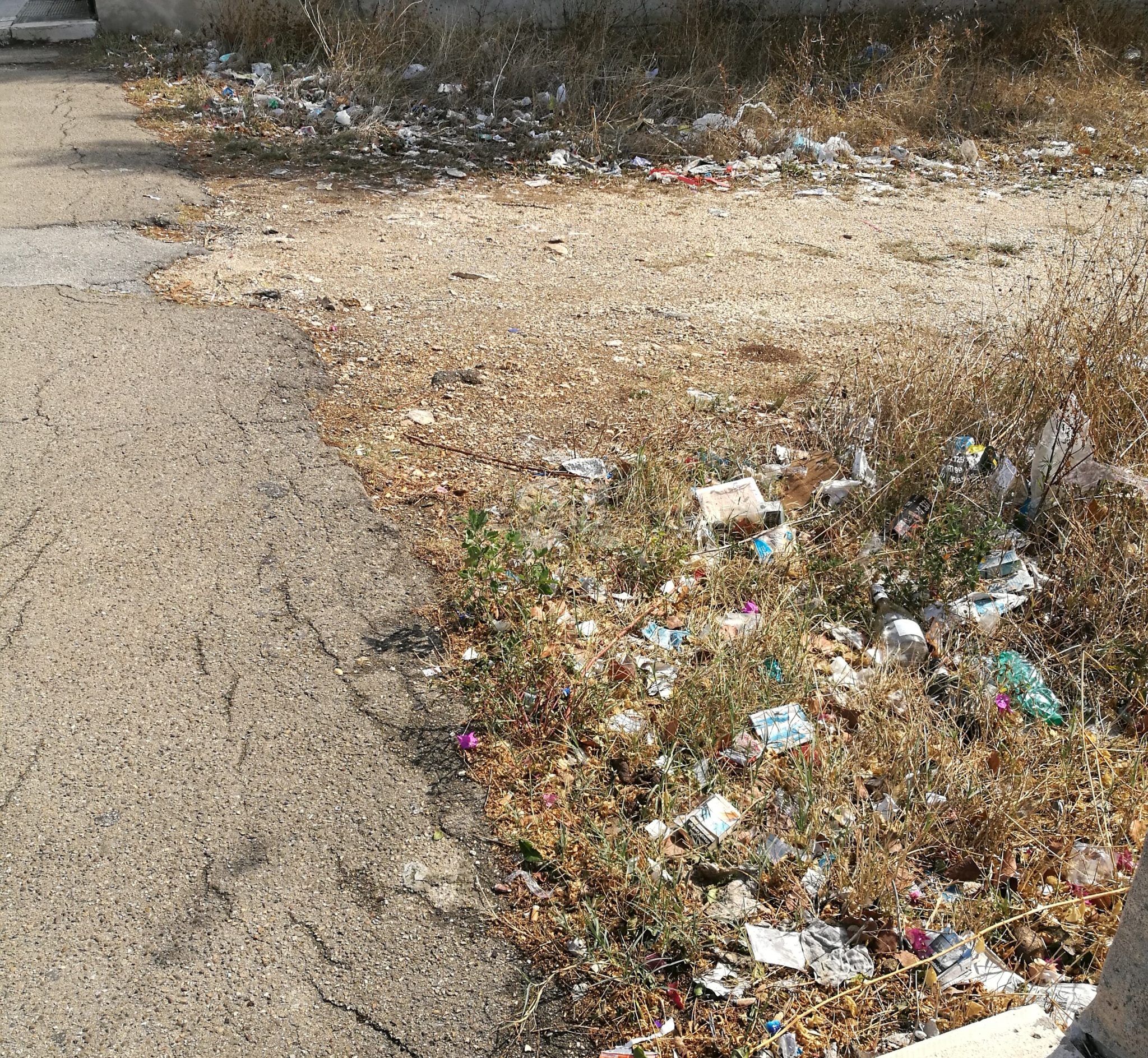 Il 17 settembre è cominciata la scuola per 120 bambini che frequentano la materna Lopopolo di viale Lazio nel rione San Paolo. Dal 17 settembre ci sono dei cocci di vetro sul marciapiede, a pochi metri dall’ingresso della scuola, e nessuno ancora dell’Amiu ha provveduto a rimuoverli. Il marciapiede, a quanto pare, non viene quindi spazzato da settimane. Ma non solo. A poca distanza c’è un suolo, forse privato ma accessibilissimo, pieno di rifiuti.