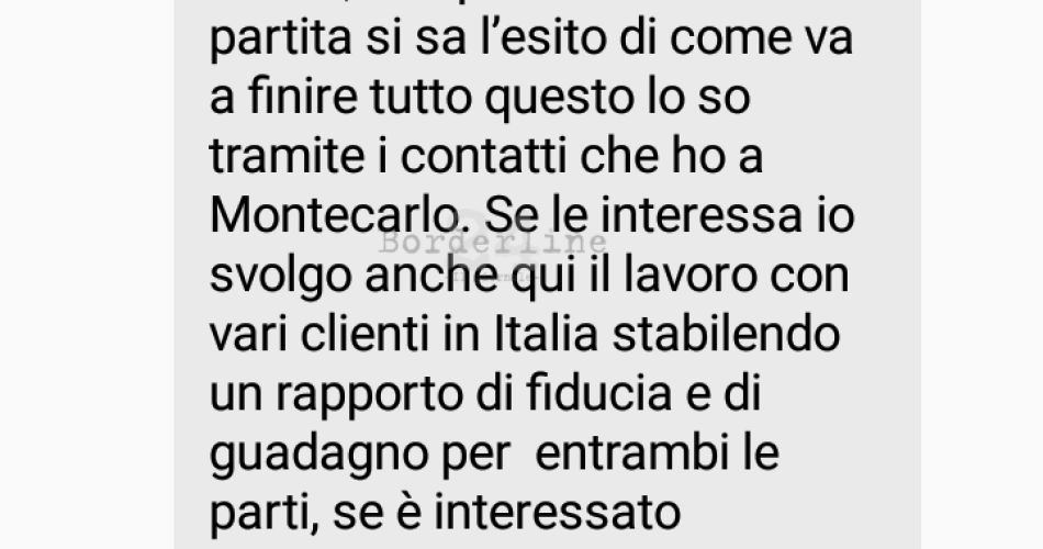 “Mi occupo di partite di calcio truccate sicure, cioè prima che inizia la partita si sa l’esito di come va a finire, tutto questo lo so tramite i contatti che ho a Montecarlo”. E’ uno dei passaggi di un lungo messaggio arrivato tramite la chat di Messenger, un messaggio arrivato da un profilo sconosciuto, falso, con il quale ci viene proposto – attraverso un meccanismo apparentemente semplice – di scommettere su partite di calcio dal risultato deciso a tavolino che ci saranno indicate. Solo a scommessa vinta, ci dice il nostro interlocutore, dovremo versare una percentuale della somma vinta a titolo di rimborso per l’imbeccata ricevuta.