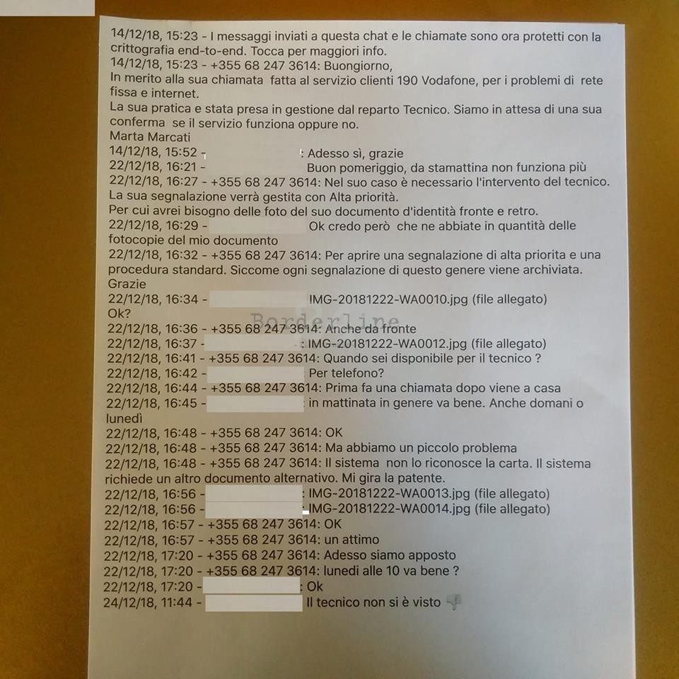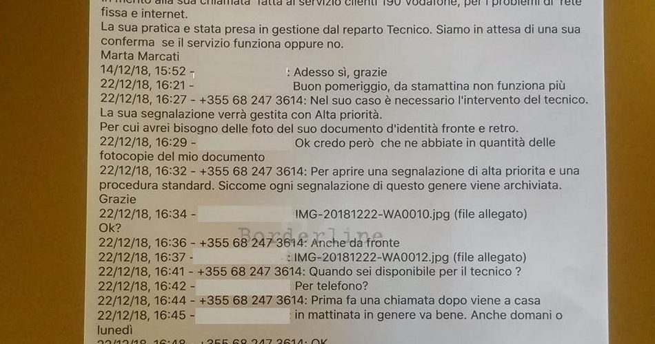 “Diversi utenti che si sono rivolti al servizio assistenza dell’operatore #Vodafone per segnalare guasti sulla rete fissa sono stati contattati su #WhatsApp, da un fantomatico “reparto Tecnico” – si legge nella segnalazione – il quale, al fine di sollecitare l’intervento di personale tecnico, richiedeva con varie scuse, copia dei propri documenti di riconoscimento e, in alcuni casi, anche una copia di un secondo documento d’identità. Ricordiamo che gli operatori telefonici non richiedono mai copie di documenti per interventi di assistenza né tantomeno utilizzano whatsapp per comunicare con la propria clientela.