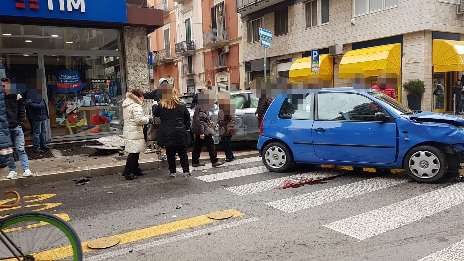 Grave incidente stradale intorno alle 11 e 20 in via De Giosa ad angolo con via Celentano, nel centro di Bari. Due auto si sono scontrate frontalmente, una vettura è finita contro la vetrina di un negozio. Al momento risultano esserci due feriti, tra cui una donna.