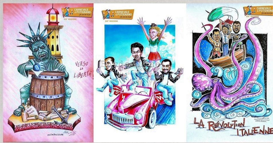 “Satira e libertà” è il tema del Carnevale di Putignano 2019, il più lungo e longevo d’Europa giunto alla 625ª edizione. I sette carri dei maestri cartapestai (il 17 e 24 febbraio e poi il 3 e 5 marzo) racconteranno la società e la politica nazionale: “La revolution italienne” raffigura Luigi Di Maio e Matteo Salvini, con a capo il Presidente del Consiglio Giuseppe Conte. Vesti da combattenti “rivoluzionari” viaggiano in una barca con il mare in tempesta. “Verso la libertà” è un gigante di cartapesta che ripropone l’icona di New York, in versione diabolica, come riflessione sul tema dei porti chiusi e diritti negati ai migranti. Anche il carro allegorico “Dream – Libertà di cambiare” ha come protagonisti i leader di M5s e Lega mentre sfrecciano a bordo di una classica anni ’50, l’Italia ha sembianze giovanili “verso un promettente futuro”.