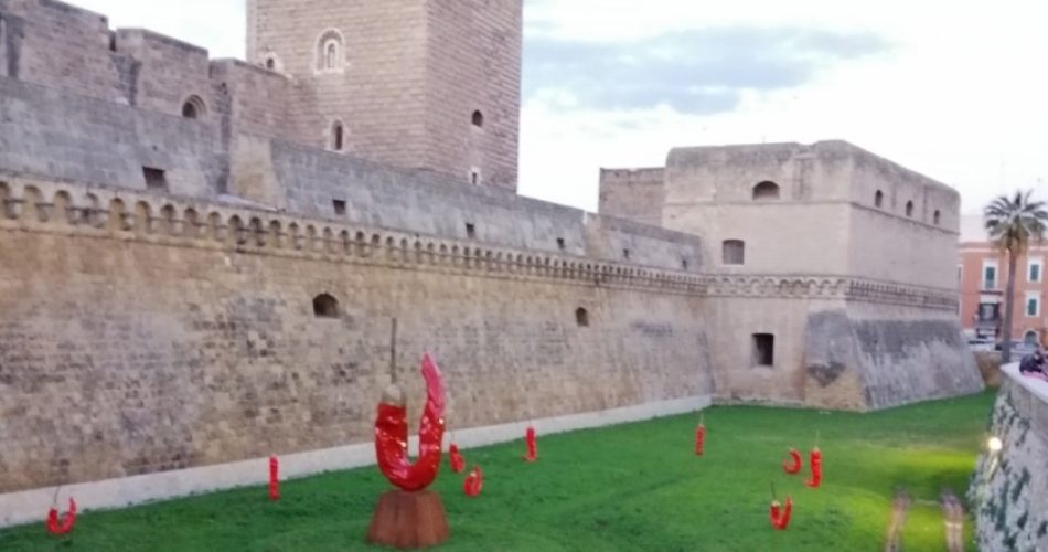 “E’ stata una domenica dal sapore primaverile qui nella nostra città di Bari. Accompagnati da un clima mite ed un forte profumo di iodio tipico del nostro centro città lambito dal profumatissimo Mar Adriatico, abbiamo visitato il magnifico Castello Svevo, la fortezza del capoluogo Pugliese risalente al XIII secolo, diventata poi prigione e adesso polo museale della Puglia. Già all’esterno siamo stati piacevolmente colpiti, essendo il fossato del castello pieno di simpatiche sculture colorate, opera dell’artista a tutto tondo Giuseppe Carta. I suoi peperoncini giganti, danno colore ed emozione e fanno presagire ciò che di fantastico può esserci all’interno delle sale del castello.