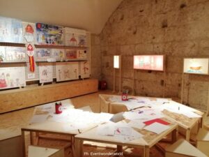 Nelle prime stanze sulla destra è in corso fino al 2020 una simpatica mostra interattiva dedicata a “San Nicola dei bambini e delle bambine. ” Prima di cominciare il tour, che ci ha fatto attraversare 5 stanze diverse intitolate “ti ascolto”, “ti mangio”, “ti gioco”, “ti scrivo”, “ti reinvento”, a seconda delle azioni che i bambini possono svolgere al loro interno e delle nozioni che vengono qui impartite, una guida preparata e appassionata del tema ci ha esposto le informazioni più importanti sul Santo, patrono della città spiegandoci come funziona la visita all’interno delle stanze e consegnando un passaporto ai bambini dove viene descritta una serie di informazioni sul Santo. All’ingresso di ogni stanza i bambini possono timbrare il passaporto così da conservare un bel ricordo della visita. Nell’ultima stanza, intitolata “ti reinvento”, i bambini hanno la possibilità di esprimere la propria creatività disegnando e quindi reinventando la figura di San Nicola, conosciuto con tanti nomi diversi nei vari paesi del mondo.