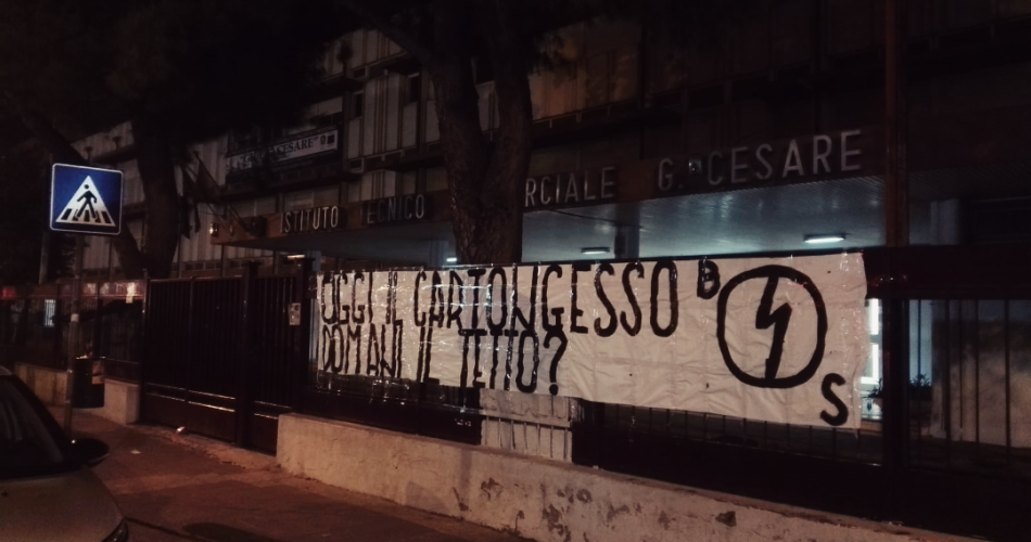“Oggi il cartongesso, domani il tetto?” questo è il testo dello striscione affisso fuori la sede centrale dell’Istituto Giulio Cesare dove si è verificato l’ennesimo crollo durante il regolare orario di svolgimento delle attività didattiche.