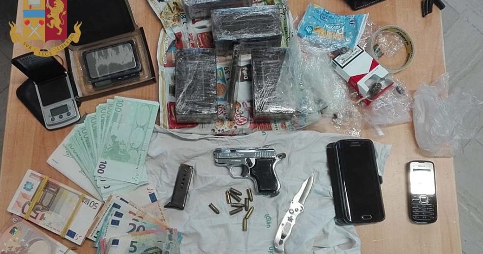 Nonostante l’uomo avesse negato in modo fermo e deciso di possedere armi o stupefacenti, i poliziotti hanno effettuato un’accurata attività di perquisizione che ha consentito di rinvenire 2 Kg circa di Hashish, una pistola marca Zastava, calibro 22 con caricatore rifornito e pronta all’uso, ed una confezione contenente altre 10 munizioni compatibili con l’arma.