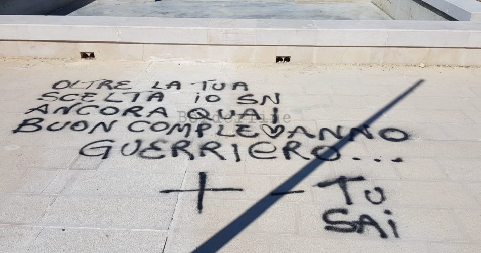 “Io so che chi ha scritto questo messaggio odia il posto in cui vive. E odia tutti noi, che siamo suoi concittadini. Sporcare la propria città, sporcare un luogo come questo, il lungomare di San Girolamo, uno spazio che i cittadini stanno aspettando da oltre trenta anni, vuol dire fregarsene di tutto e di tutti. E anche fregarsene di se stessi. Perché chi si comporta in questo modo, non vuole bene nemmeno al proprio futuro”. Così il sindaco Antonio Decaro questo pomeriggio sul waterfront di San Girolamo per denunciare l’ennesimo atto vandalico.