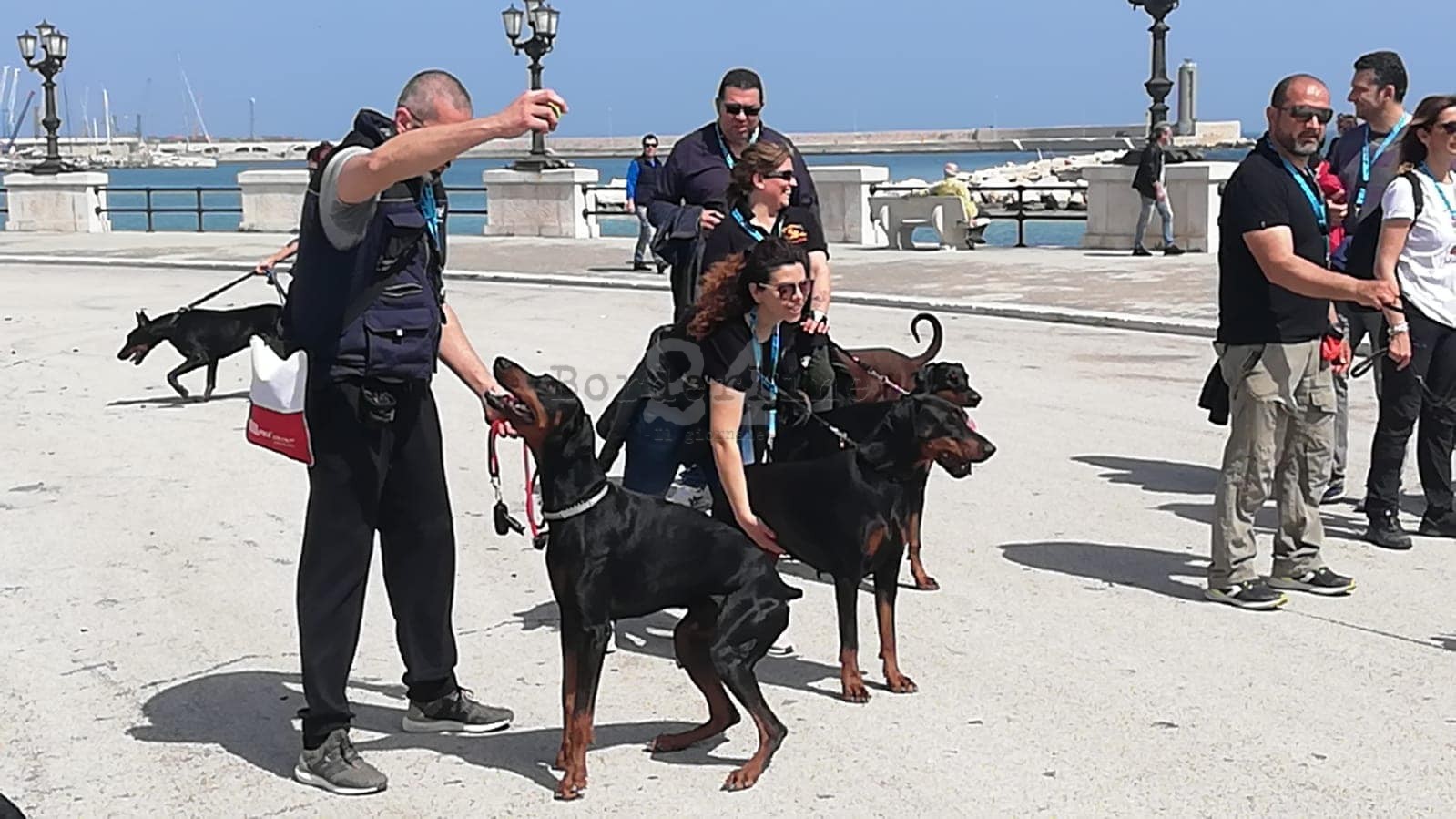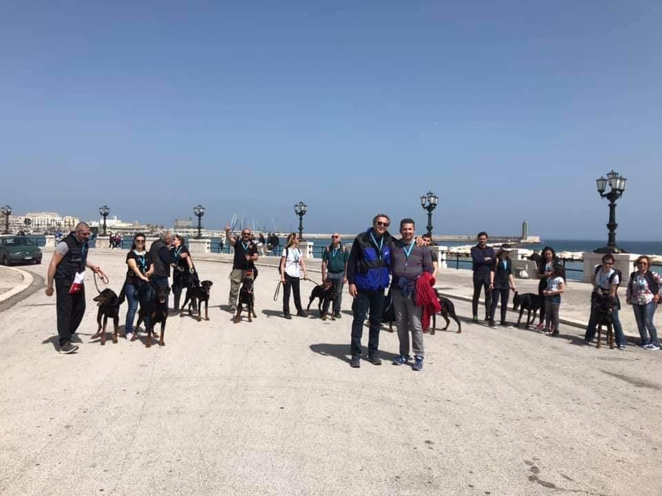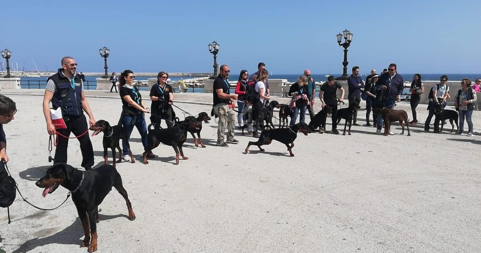 Una passeggiata sul lungomare da Pane e pomodoro a piazza del Ferrarese. Protagonisti venti dobermann e i loro padroni che hanno così voluto partecipare al Dobermann day organizzato dalla sezione AIAD (Associazione Italiana Amatori Dobermann) di Puglia. A promuovere l’evento Angelo Magnifico, presidente dell’Aiad Puglia.