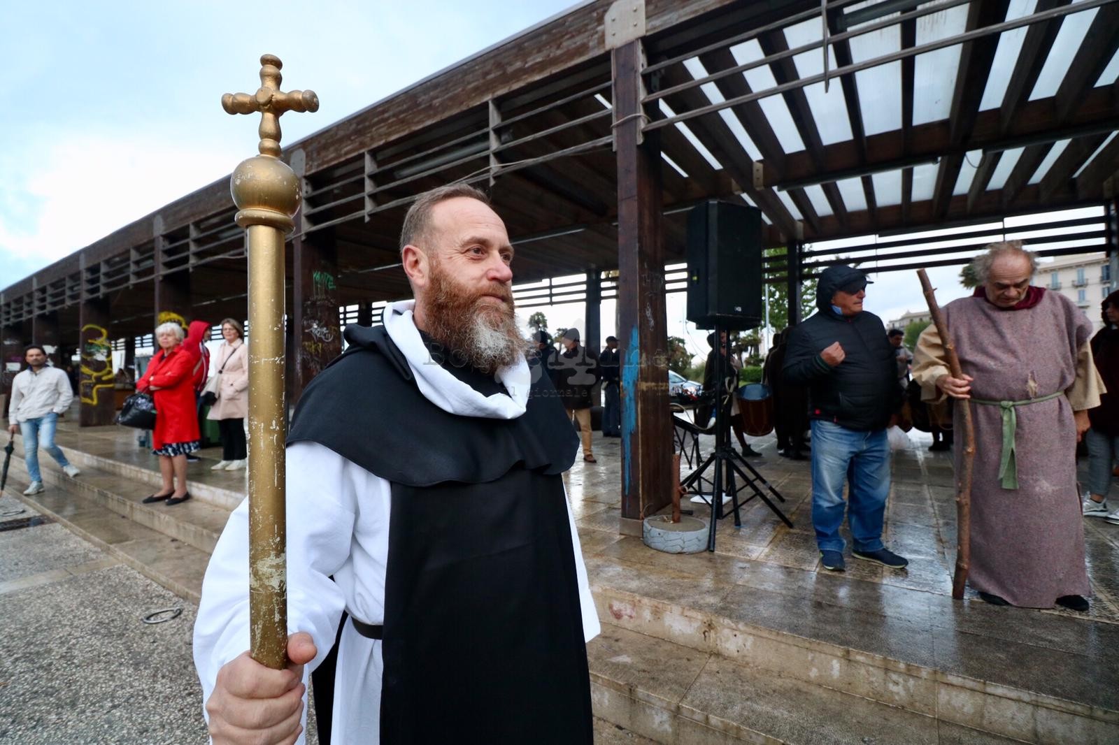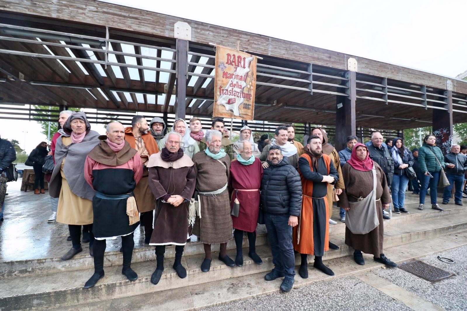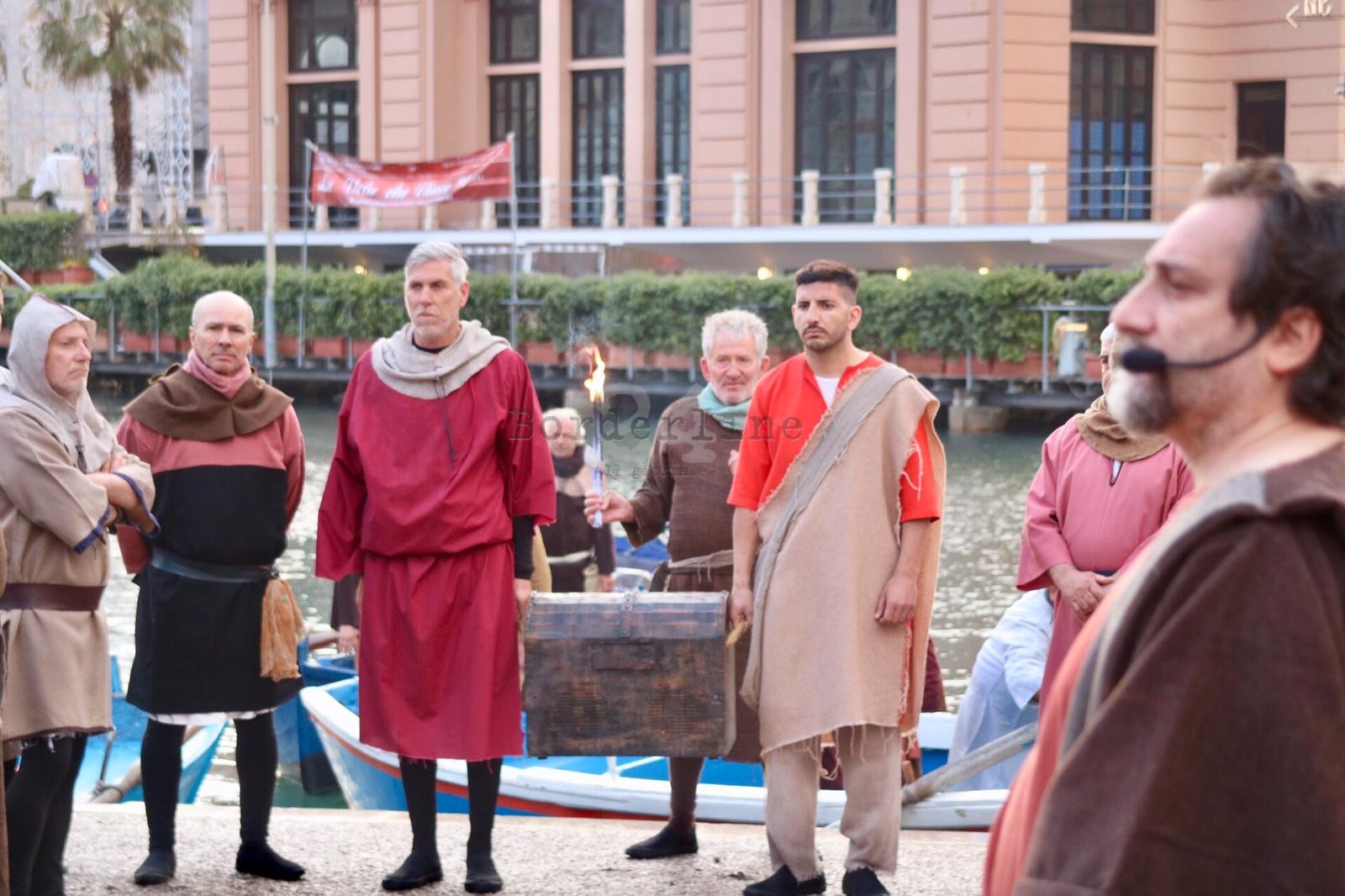 Al molo San Nicola, figuranti, banditori e sbandieratori hanno portato le sacre ossa del Santo attraverso i vicoli della città vecchia. Sullo sfondo i gozzi (le tradizionali barche a remi dei pescatori) illuminati da fiaccole, i figuranti in costume storico, le padelle romane, i timpanisti di Militia Sancti Nicolai che riproducono le sonorità del passato.