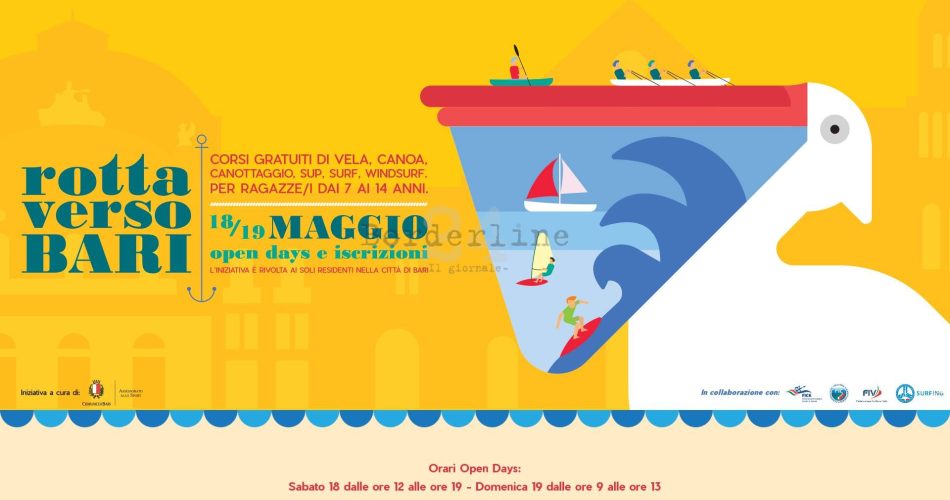 Si terranno anche domani, domenica 19 maggio, gli open days della quarta edizione di “Rotta verso Bari”, il progetto ideato dall’assessorato comunale allo Sport in collaborazione con i circoli nautici, le associazioni sportive cittadine e le federazioni di Vela, Canoa e Canottaggio, al fine di promuovere la pratica gratuita degli sport nautici tra i bambini e i ragazzi residenti nella città di Bari, di età compresa tra i 7 ai 14 anni, valorizzando il rapporto della città con il mare.
