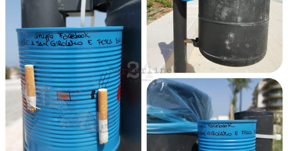 Arrivano i posacenere fai da te sul lungomare San Girolamo. Realizzati dai cittadini riuniti nella pagina “Vivere San Girolamo – Fesca”. “Noi crediamo che per essere credibili dobbiamo tutti sporcarci le mani – scrivono i residenti – Questo pomeriggio abbiamo installato i primi posacenere sul nostro lungomare, per cercare di tenere più pulito il nostro quartiere. Noi abbiamo fatto la nostra parte e per ora abbiamo coperto una zona del Lungomare. Ci occuperemo di svuotarli, ma questa operazione è solo un modo per stimolare l’amministrazione all’installazione di posacenere definitivi. Noi dimostriamo di utilizzarli con la nostra civiltà”.