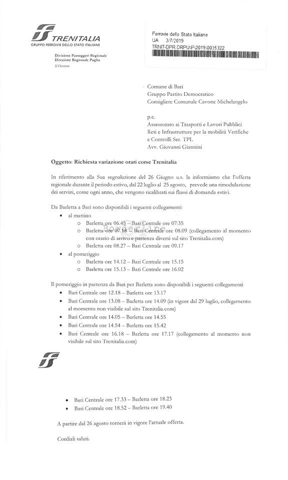 “Due le novità importanti – spiega Cavone – un regionale che partirà da Barletta alle ore 07.18 e arriverà a Bari alle ore 08.09 e dal 29 luglio il ripristino del treno con partenza da Bari alle 13.08 e arrivo a Barletta alle ore 14.09. Non è quello che volevamo, ma un segnale positivo c’è”.