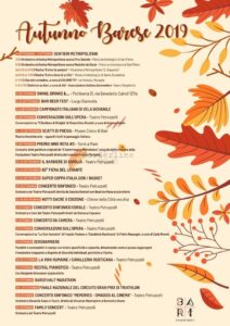 Il 6 e 7 settembre invece, lungo la muraglia di Bari vecchia si potranno gustare i prodotti tipici del nostro territorio con il “Cibo del Contadino” organizzato Coldiretti. Mentre dal 5 al 7 ottobre, all’interno del teatro Margherita, la terra di Bari ospita le eccellenze del Trentino con Bollicine su Bari, a cura di AIS – Associazione Italiana Sommeliers.