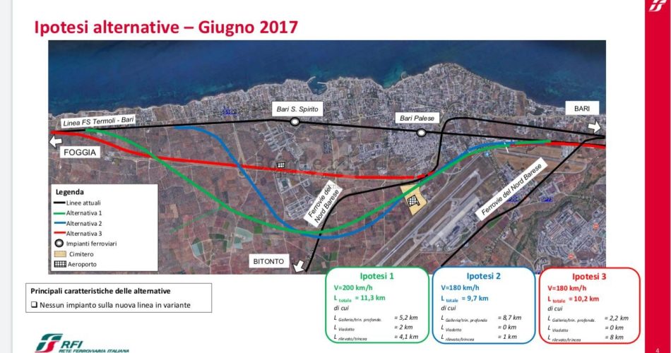 I programmi di sviluppo della mobilità nell’area nord di Bari che l’amministrazione intende portare avanti prevedono lo spostamento dell’attuale tratta ferroviaria RFI, con il relativo traffico ferroviario dei treni a lunga percorrenza e ad alta velocità, su un nuovo tracciato ferroviario in variante a quello attuale che per un tratto significativo scorre in adiacenza alla SS16 utilizzando un corridoio di suolo già utilizzato dalla predetta infrastruttura stradale.