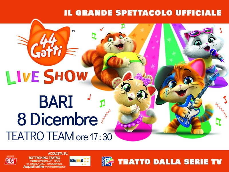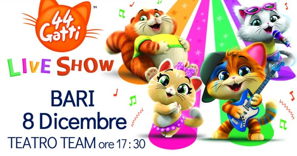 Dopo aver già calcato i palcoscenici di Roma, Milano, Firenze e Torino, il 44 Gatti Live Show arriva finalmente anche a BARI (domenica 8 dicembre alle ore 17.30 al Teatroteam). Per l’occasione, DA 0 A 14 – in collaborazione con Rainbow – ha deciso di regalare ai propri fan 10 biglietti omaggio per assistere allo spettacolo.