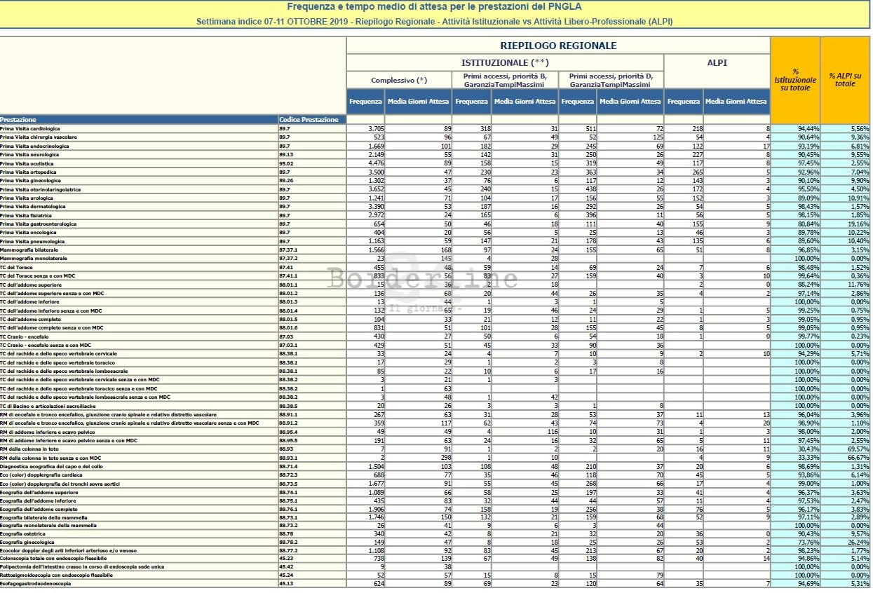La scorsa settimana, analizzando i tempi di attesa riferiti sempre alla settimana indice 07-11 ottobre 2019, ne è risultato che per alcune prestazioni, la percentuale di prenotazione entro i tempi è rimasta inferiore al 50% e spesso addirittura al di sotto del 20%. Oggi, il confronto tra prestazioni istituzionali e a pagamento rivela che le file al CUP continuano a essere molto lunghe e che l’attività libero-professionale mantiene invece carattere di brevità. Per esempio, dal riepilogo regionale sul monitoraggio dei tempi d’attesa, emerge che per una prima visita cardiologica, per una prenotazione con classe di priorità B (da eseguire entro i 10 giorni) occorre aspettare in media 31 giorni, per una prenotazione con classe di priorità D (da eseguire entro 30 giorni se riferita ad una visita specialistica, da eseguire entro 60 giorni se riferita ad una prestazione strumentale) bisogna attendere 72 giorni, ma – quasi miracolosamente – i giorni di attesa diventano solo 8 se la visita è a pagamento.