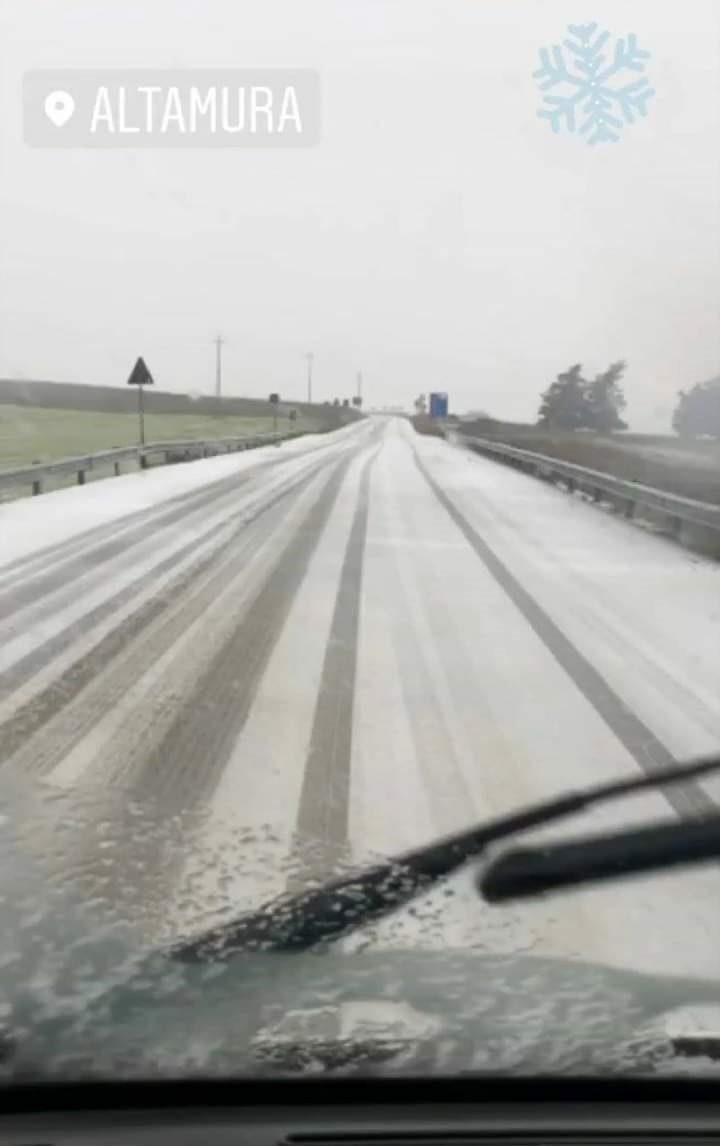Sulla Murgia barese si intensifica la nevicata e si registrano i primi disagi per gli automobilisti: sulle strade, infatti, inizia a depositarsi e accumularsi neve e nel tardo pomeriggio è previsto un ulteriore aumento delle precipitazioni (foto MeteOne Puglia e Basilicata).