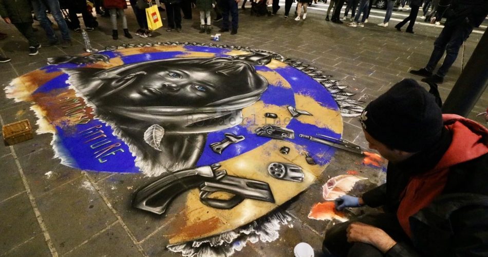 L’artista di strada “Martino Pitture”, di origine pugliese ma residente da anni a Berlino, ha realizzato un’opera molto apprezzata dal pubblico barese che ha scelto di approfittare del primo giorno di saldi in via Sparano. Ieri, 4 gennaio, il “madonnaro” moderno è stato accolto per 48 ore nella zona dello shopping, con il tipico stile dei disegni tracciati sul selciato con gesso, gessetti o altro materiale povero senza però immortalare figure legate ai culti religiosi.