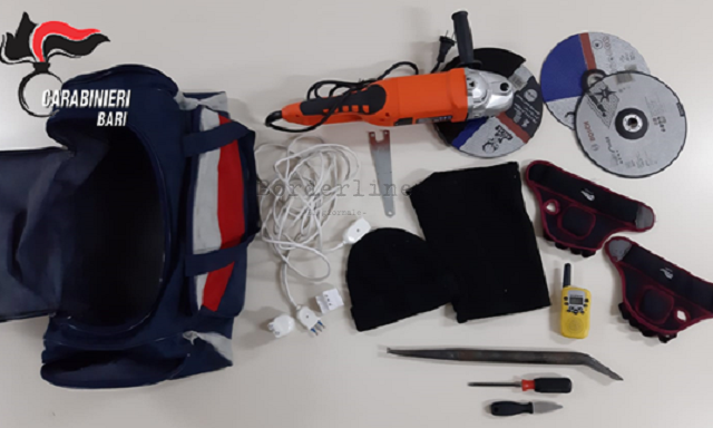 Era da tempo che i militari stavano monitorando il fenomeno dei furti in appartamento consumati in provincia di Bari ed a finire nella rete è stato un malfattore che si aggirava in centro a bordo della sua autovettura, mentre utilizzava un walkie talkie. I militari insospettiti dall’atteggiamento, hanno proceduto al suo controllo con una perquisizione personale e veicolare, rinvenendo un borsone contenente vari attrezzi atti allo scasso.