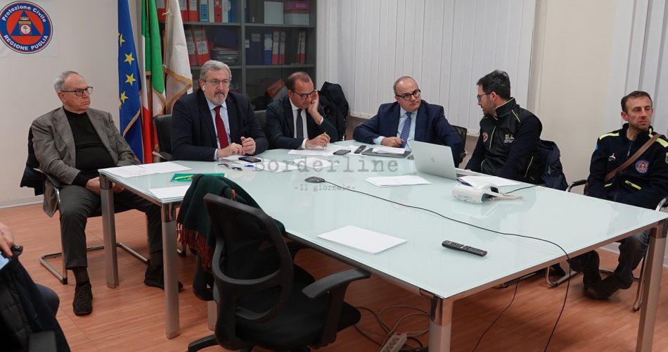Presenti alla riunione dalla sede di Bari della Protezione Civile anche il dirigente di sezione Mario Lerario e i vertici della Protezione civile regionale, il vice presidente Antonio Nunziante, il consigliere delegato Ruggiero Mennea, il capo dipartimento salute Vito Montanaro.