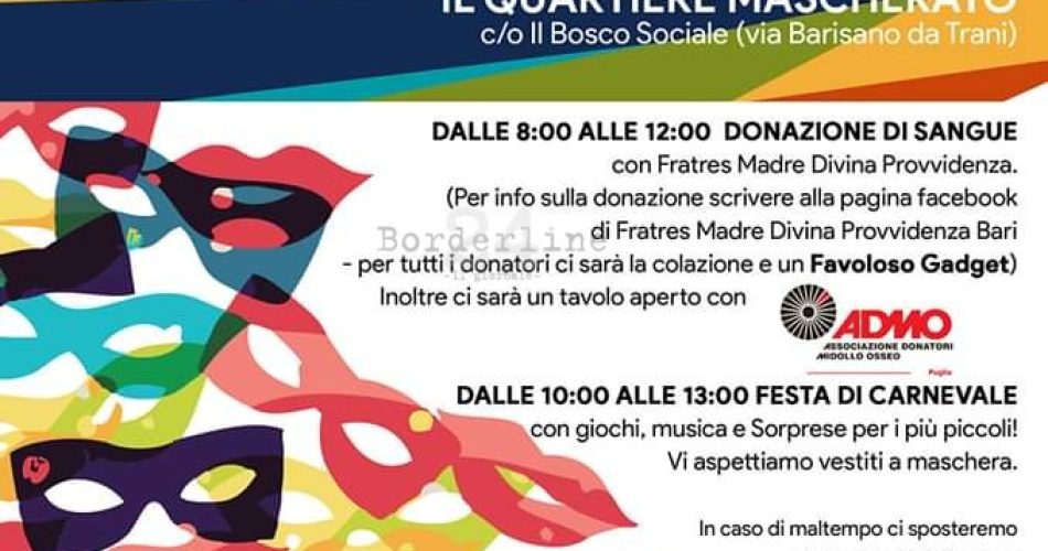 Festa di carnevale al San Paolo di Bari con sensibilizzazione alla cultura del dono, truccabimbi, animazione, musica, giochi sportivi e solidarietà. È “Il quartiere mascherato” e si svolgerà domani (martedì 25 febbraio) dalle 10 alle 13 nel Bosco Sociale di via Barisano da Trani. L’appuntamento della Rete Civica Urbana “Kilim” San Paolo-Stanic-Villaggio del Lavoratore – ad accesso libero e gratuito – sarà anche l’occasione per donare sangue: per i cittadini interessati, la mattina dalle 8 alle 12 sarà disponibile l’autoemoteca con gli operatori dell’associazione Fratres Madre Divina Provvidenza che offriranno ai donatori la colazione e un gadget. L’evento è organizzato da Associazione di volontariato In.Con.Tra., Associazione Mondo Migliore Bari, Cooperativa Sociale Arcoiris, Cooperativa Sociale Tracceverdi e Fratres Madre Divina Provvidenza in collaborazione con Associazione donatori midollo osseo (Admo) Puglia. Per informazioni: 331.3389489. In caso di maltempo l’evento si svolgerà nella Scuola di Ciclismo “Franco Ballerini” in via Ricchioni 1.