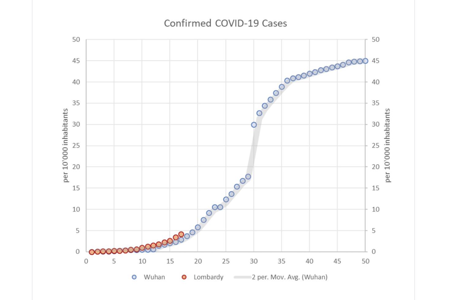 Secondo le statistiche del Ministero della Salute i casi di Covid-19 in Lombardia hanno superato quota 5mila – aggiornamento 9 marzo. In costante aumento giorno dopo giorno con picchi dei cittadini positivi al tampone a Bergamo, Lodi, Cremona, Brescia, Milano. Un grafico di Silvia Merler pubblicato su Twitter, economista italiana ex membro del “Think thank economico Bruegel”, con sede a Bruxelles, confronta la progressione dei contagi tra la Lombardia e la prima città focolaio, Wuhan (immagine in basso). Il tasso di crescita giornaliero è del +48% come in Cina, dove le limitazioni stringenti che hanno costretto a barricarsi milioni di persone nella propria abitazione sono scattate al settimo giorno, a differenza dell’Italia in cui sono trascorse più di due settimane prima dell’allerta del governo Conte.