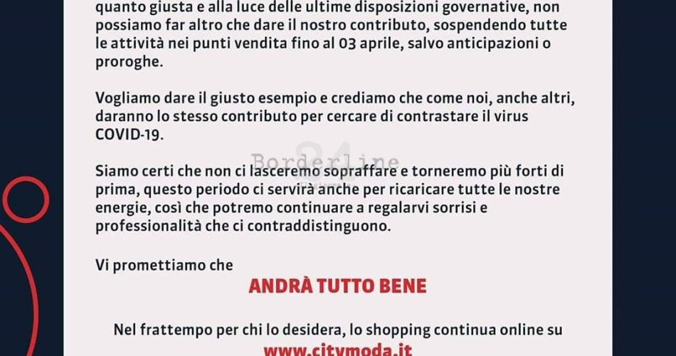 CityModa ha annunciato attraverso la propria pagina facebook che sino al 3 aprile, per dare il proprio contributo a bloccare l’epidemia di coronavirus, sospenderà tutte le attività nei punti vendita. “Una decisione tanto sofferta quanto giusta”, si legge. “Vogliamo dare il giusto esempio – è scritto – e crediamo che come noi anche altri daranno lo stesso contributo per cercare di contrastare il virus Covid-19”.