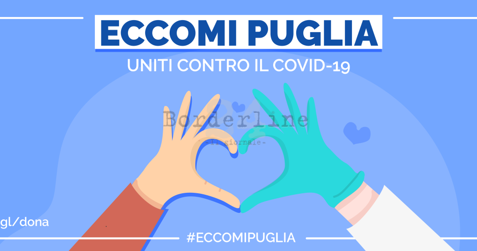 La Regione Puglia e la Protezione civile regionale rilanciano sui social la campagna di donazioni spontanee nata a sostegno degli sforzi che tutto il sistema sanitario e di protezione civile sta facendo per l’emergenza coronavirus. “Eccomi Puglia. Uniti contro il Covid19”, è intitolata la campagna partita l’11 marzo scorso. Ad oggi è stata raccolta la cifra di 1.962.455 euro.