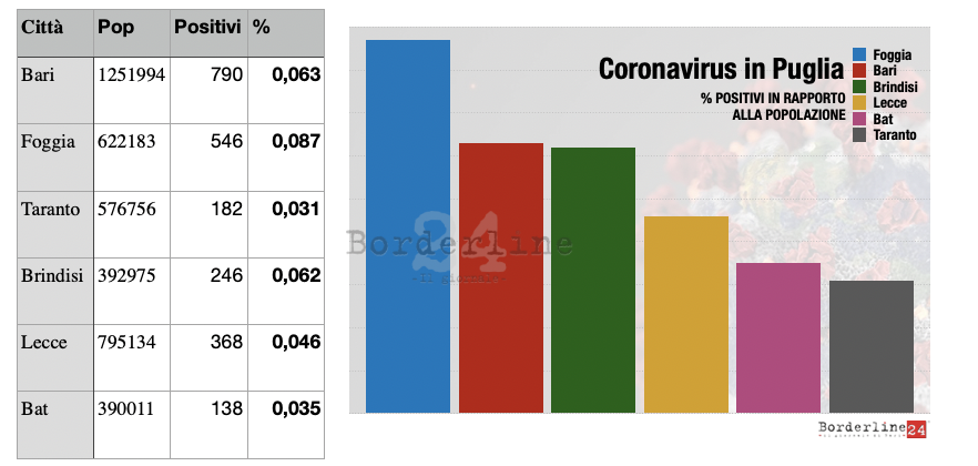 Nel focus della percentuale dei positivi in rapporto alla popolazione è possibile osservare l’istogramma delle sei province pugliesi (grafico in basso). Le statistiche dimostrano come nella provincia di Foggia ci sia la maggiore incidenza di contagi: lo 0,087%, un positivo ogni 1.149 cittadini. Segue la provincia di Bari 0,063% un contagiato ogni 1.587, Brindisi 0,062% (uno ogni 1.612), Lecce 0,046% (uno ogni 2.173), Bat 0,035% (uno ogni 2.857), Taranto 0,031% (uno ogni 3.225).
