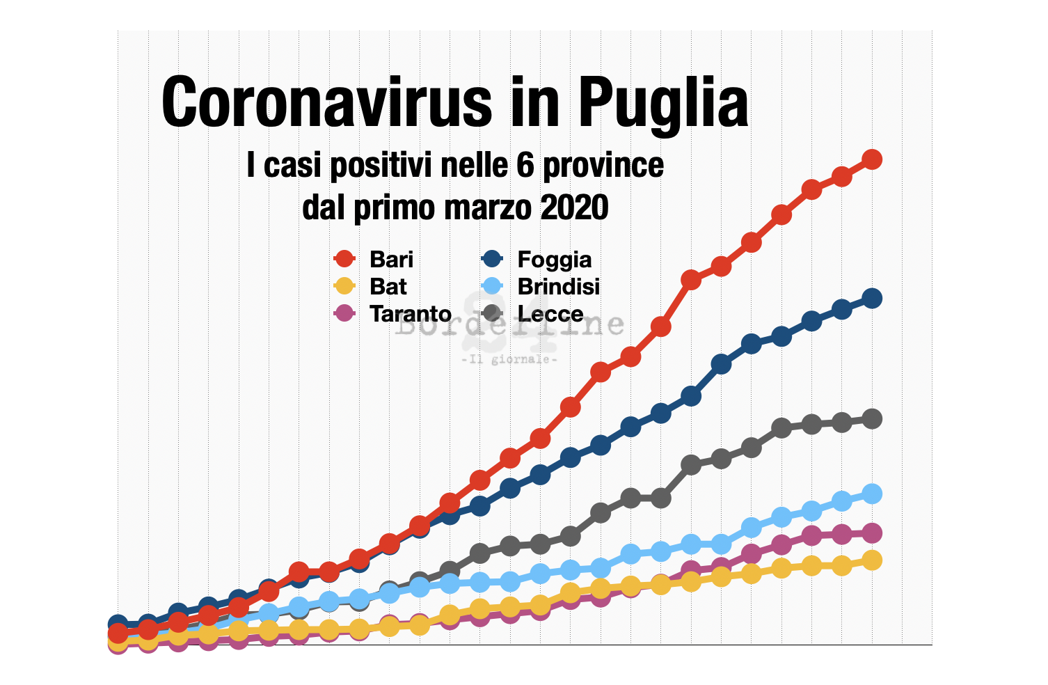 Il totale dei casi positivi Covid in Puglia – aggiornamento 5 aprile – è di 2.317 così divisi: 790 nella Provincia di Bari; 138 nella Provincia di Bat; 246 nella Provincia di Brindisi; 564 nella Provincia di Foggia; 368 nella Provincia di Lecce; 182 nella Provincia di Taranto. Nel grafico in basso la progressione per ogni singola area.