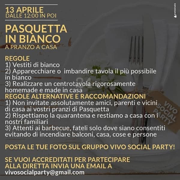 Per questo il presidente Amgas Vanni Marzulli, insieme ad altri cittadini baresi, ha deciso di creare un evento comunitario per condividere in modo alternativo il pranzo del 13 aprile dalle 12 in poi. Ecco le semplici regole: vestirsi di bianco, apparecchiare o imbandire la tavola il più possibile in bianco, realizzare un centrotavola rigorosamente “tradizionale e homemade”. Le regole alternative: non invitate assolutamente amici, parenti e vicini di casa ai vostri pranzi, rispettiamo la quarantena e restiamo a casa. Attenti ai barbecue, fateli solo dove siano consentiti evitando sgradite conseguenze sui balconi.