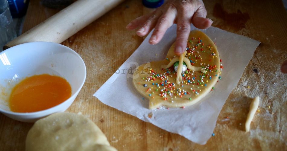 Gli ingredienti: 500 grammi di farina, 160 grammi di zucchero, 2 uova, 50 gr di latte, mezza bustina di lievito, una bustina di vanillina e scorza di limone grattugiato. Il procedimento: lavorare il preparato a mano fino a quando l’impasto non diventa liscio ed elastico. Nella fase successiva si stende la massa definendo la forma della colomba (manualmente o attraverso l’ausilio delle formine in metallo). Gli occhi posso essere realizzati con una goccia di cioccolata o con un chicco di caffè. Si spennella con un po’ di latte e infine si aggiunge un uovo sodo (o ovetti di cioccolata) e la codetta mista per conferire vivacità. Si inforna a 180 gradi per circa 40 minuti.