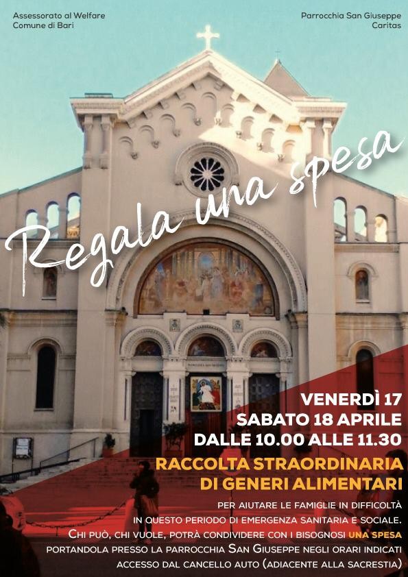 L’iniziativa “Regala una Spesa”, che si inserisce nell’ambito dei numerosi progetti di solidarietà messi in atto, nelle ultime settimane, sul territorio cittadino, è organizzata all’assessorato al Welfare del Comune di Bari con la collaborazione della Chiesa di San Giuseppe, nel quartiere Madonnella della città.