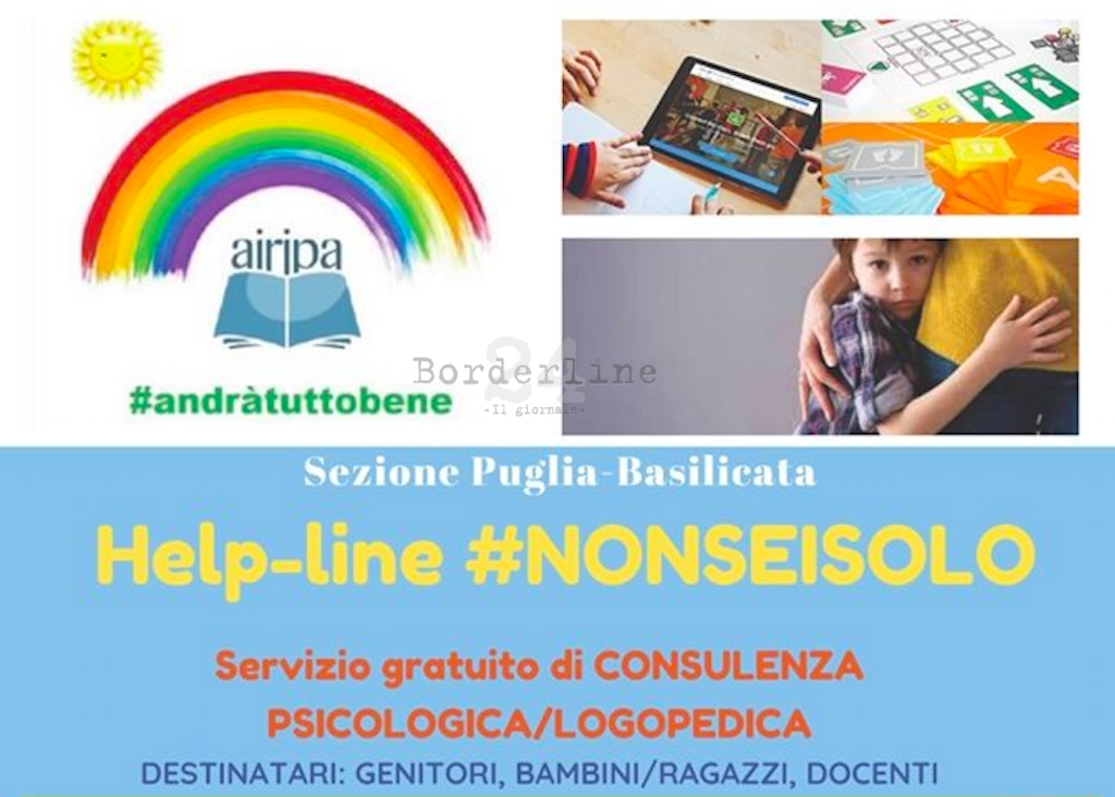 Una “Help Line” per offrire supporto psicologico e logopedico alla popolazione in un momento di grave emergenza socio-sanitaria. È il progetto promosso dalla sezione Puglia e Basilicata dell’Airipa, Associazione Italiana per la Ricerca e l’Intervento nella Psicopatologia dell’Apprendimento che, grazie all’impegno di 25 esperti pugliesi, tra psicologi e logopedisti, mette a disposizione uno sportello di consulenza a distanza – tramite contatti telefonici, skype o altri sistemi di comunicazione da remoto – per famiglie, ragazzi e docenti, al fine di offrire sostegno negli ambiti più svariati, da quello scolastico a quello emotivo, finanche a quello della didattica inclusiva.