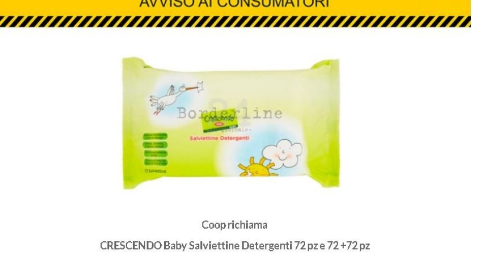 La Coop invita i consumatori che avesse acquistato il prodotto a non utilizzarlo e restituirlo al punto vendita per il rimborso. Ecco i prodotti interessati dal ritiro: Crescendo Baby Salviettine Detergenti 72 pz (8001120598516) e Crescendo Baby Salviettine Detergenti 72+72 pz (80011205985323).