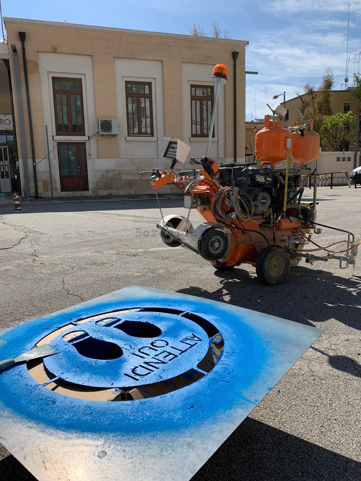 “Al Policlinico di Bari al posto dei nastri bianchi e rossi si è preferito realizzare questi stencil che contrassegnano le aree di attesa con la giusta distanza da mantenere per l’accesso al centro prelievi, al bar interno, presto anche al pronto soccorso oculistico e altre aree. Potete anche muovervi basta non invadere altre aree”.