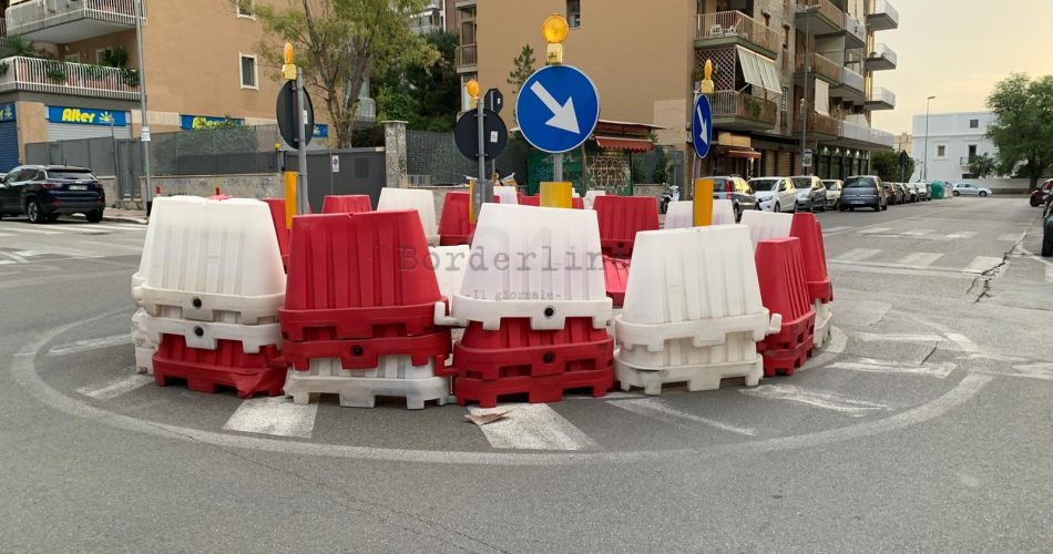 Nelle ultime ore, in seguito al forte vento di scirocco delle scorse ore, alcuni divisori biancorossi si sono spostati di qualche metro, altri restano accatastati uno sull’altro perfino davanti alle strisce pedonali in stile Lego. Nella foto in basso si nota la disposizione originaria a marzo 2018, come soluzione temporanea del Comune per provare a ridurre gli incidenti che interessano questa zona.