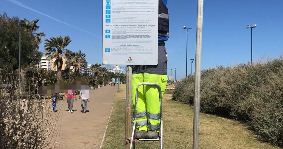 “Tutti gli utenti sono individualmente responsabili nell’adottare comportamenti rispettosi delle misure di prevenzione”. Si legge così su uno dei cartelli che il Comune sta sistemando all’ingresso di tutte le spiagge libere della costa barese. Sono poi elencate le regole per l’accesso, secondo quanto definito dall’ordinanza regionale. Regole sia generali come ad esempio evitare abbracci e strette di mano, non usare bottiglie e bicchieri usati da altri, lavarsi spesso le mani, sia strettamente legate alle attività di spiaggia come ad esempio il divieto di stazionare sulla battigia. Deve essere mantenuta la distanza di un metro tra persone, un metro e mezzo tra attrezzature come lettini o sdraio e ciascuna postazione ombrellone dovrebbe occupare una superficie di 10 metri quadrati.