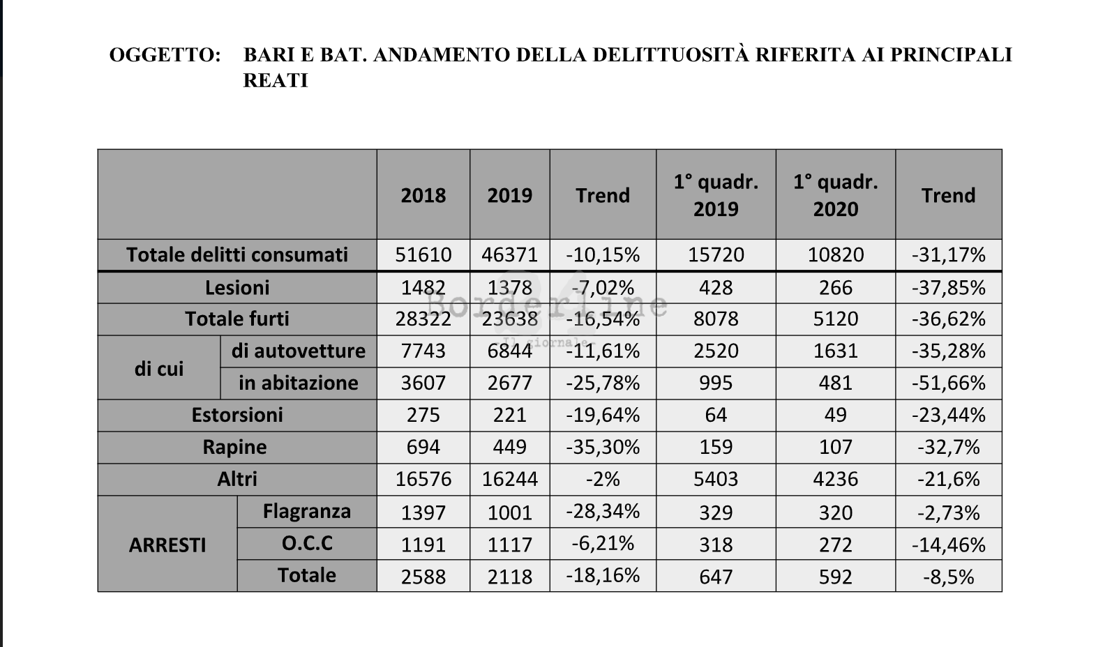 Il bilancio. Il periodo appena passato ha fatto registrare, rispetto al primo quadrimestre dello scorso anno, una complessiva diminuzione dei delitti in genere (-31%). In particolare, i furti di auto sono diminuiti del -35%, e quelli in abitazione del -51% e le rapine -32%. Questa diminuzione è legata anche al fatto che ogni movimento di persone era considerato straordinario e pertanto quasi tutti coloro che venivano trovati al di fuori delle abitazioni venivano controllati, soprattutto in orario notturno. Le prescrizioni imposte a livello nazionale sulla libertà dei movimenti hanno quindi impedito anche ai malintenzionati di muoversi liberamente.