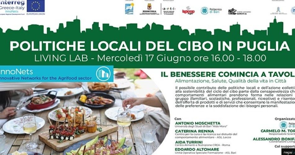 Il progetto prevede anche il confronto tra tutti gli attori coinvolti – tra cui alcuni enti regionali e Camere di Commercio greche e italiane – attraverso un ciclo di quattro appuntamenti online dal titolo “Living Lab”: si è partit oggi con il talk “Il benessere comincia a tavola: alimentazione, salute, qualità della vita in città” che sarà trasmesso in diretta streaming sulla pagina Facebook InterregInnoNets. Durante l’incontro, è stato affrontato il tema del ruolo della nutrizione come snodo fra la promozione della salute umana e la mitigazione dell’impronta ecologica delle nostre società sul pianeta, nonché l’attuale cambiamento dei consumi alimentari della popolazione.